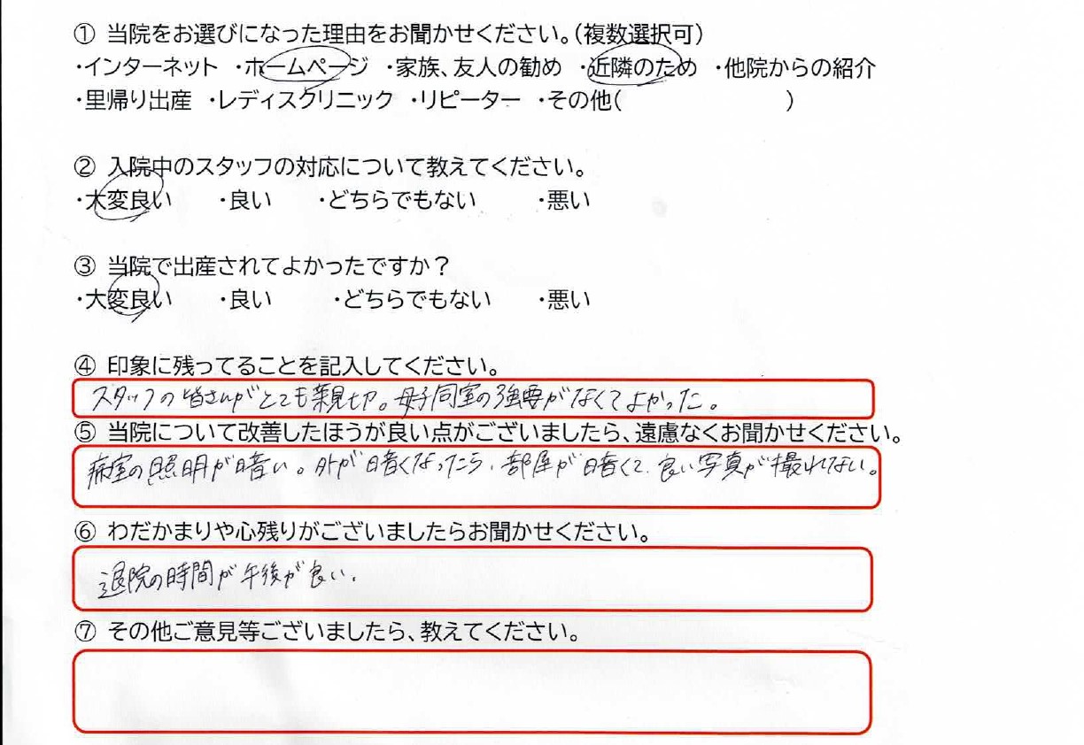 西原院長、助産師、スタッフの皆さんお優しく接してくださり嬉しかったです。ありがとうございました。個室の照明が落ち着いて良いのですが、明るくできる照明があったら良いなと思いました。また、入院中スタッフにお伝えしたことが他スタッフに伝わっていなかったことがいくつかありました。